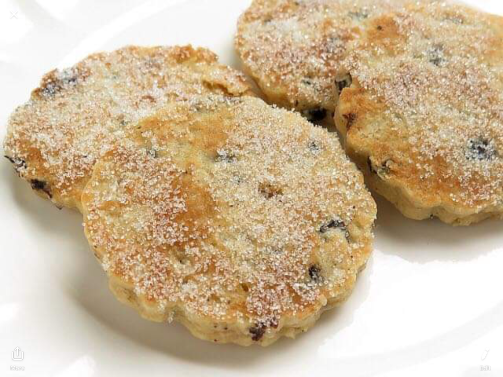 A special taste from Wales. Griddle scones cooked on a hot griddle or cast iron fry pan. A cross between a pancake and a biscuit. Flakey, tastey & melt in yer mouth. Serve warm with butter.